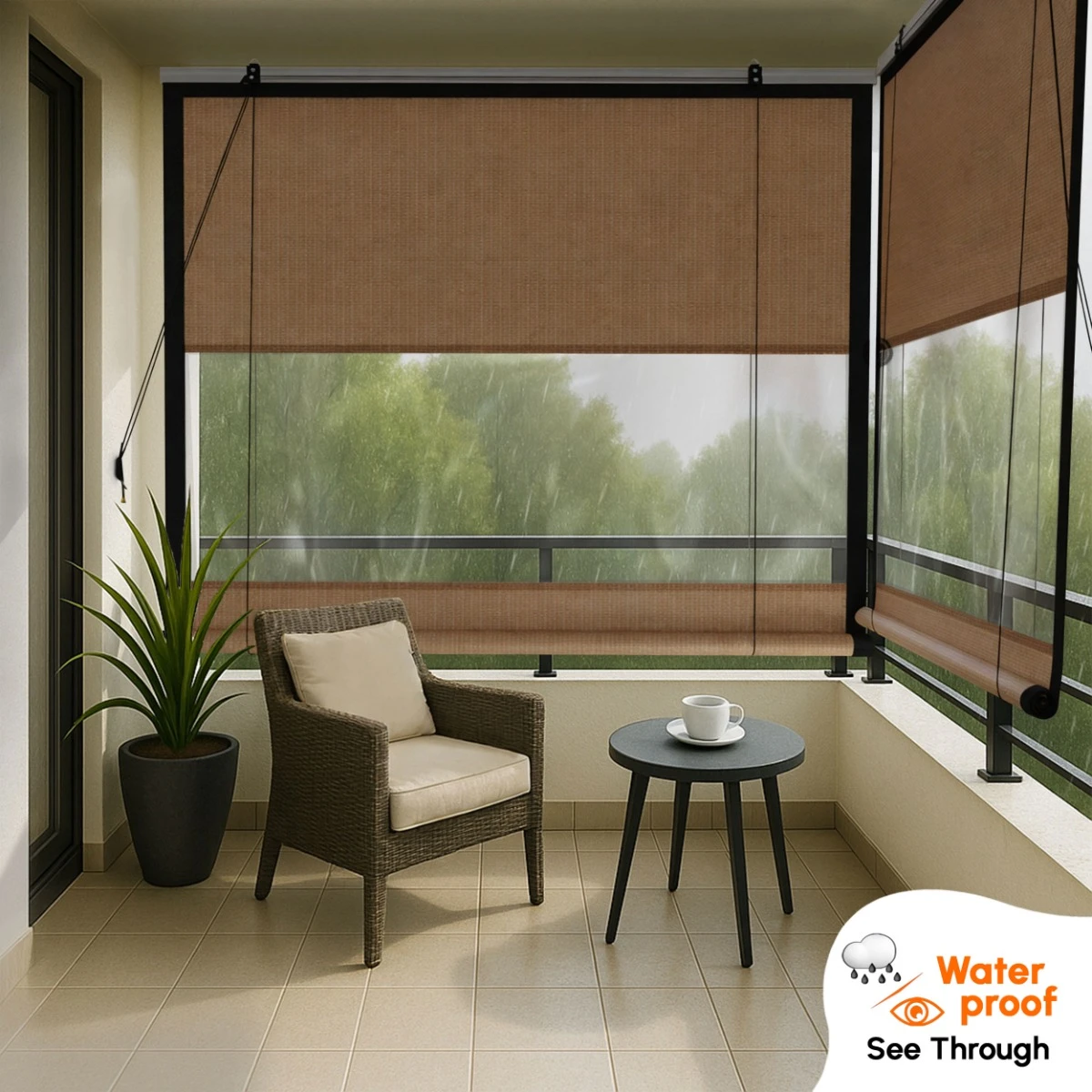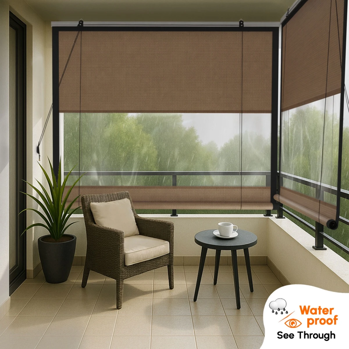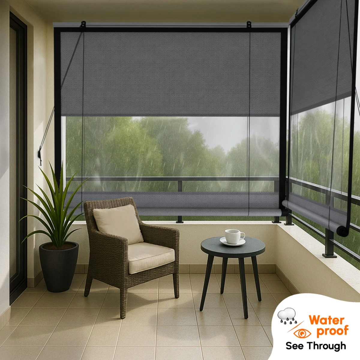 Ideal for balconies, verandas, and semi-open spaces, the blind protects against rain, harsh sunlight, and dust while allowing natural light to flow in. Its smart dual-layer construction features breathable HDPE fabric at the top and bottom for airflow and heat control, with a clear PVC center panel that keeps you visually connected to the outdoors—even during rainy weather.
