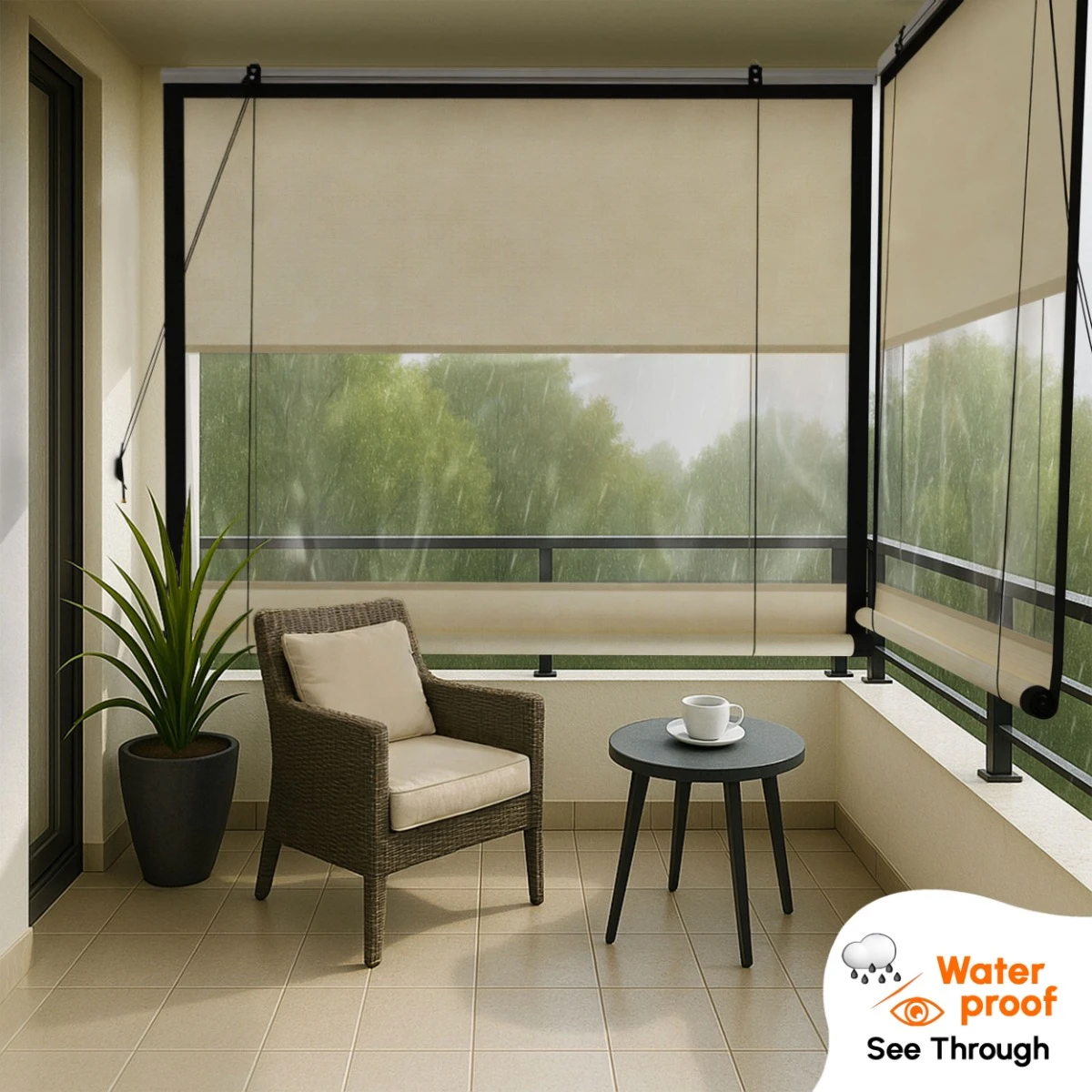 Ideal for balconies, verandas, and semi-open spaces, the blind protects against rain, harsh sunlight, and dust while allowing natural light to flow in. Its smart dual-layer construction features breathable HDPE fabric at the top and bottom for airflow and heat control, with a clear PVC center panel that keeps you visually connected to the outdoors—even during rainy weather.
